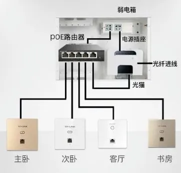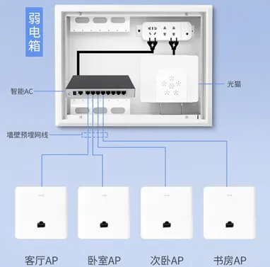 AC(接入控制器,Access Control)+AP(无线接入点,Access Point)方案一般用于大规模无线部署方案。其架构先是光纤入户后由光猫进行信号转换,通过网线与AC相连,并由AC路由器设备统一对部署在各个房间的无线面板AP进行管理,实现信号跨越墙体、消除覆盖四角的效果。此方案需要提前布线规划,否则只能后加明线,信息处理压力集中于AC上,而AP功能单一且安装复杂,对网线质量有一定要求。