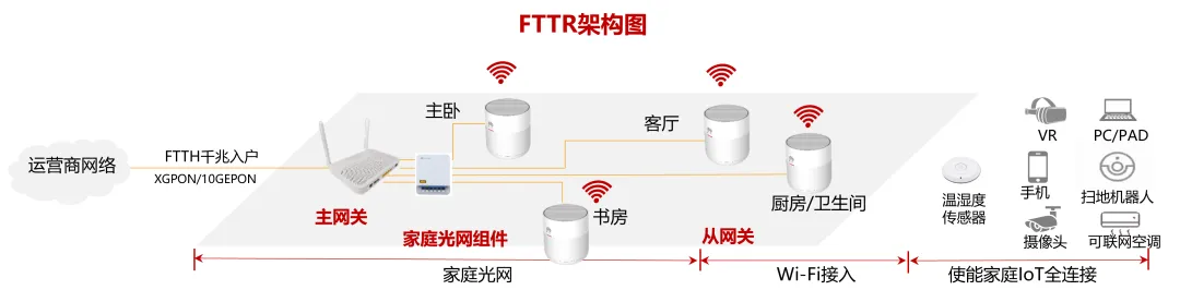 FTTR(Fiber To The Room,光纤入室)简而言之是将光纤网络连接延伸到建筑物内的每个房间或区域。在之前的FTTH组网中,光信号在入户处被光猫终结,只入户但不入室。而新的FTTR架构下,光网络的末端进一步下沉到每个从网关,FTTR主网关起到“承上启下”的作用,将光进铜退延伸到各个房间。