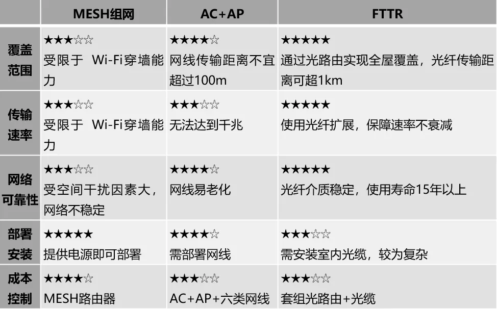 通过上表可得知,FTTR在覆盖范围、传输速率和可靠性上皆有显著优势,虽需要进行布线且成本目前较高,但总体而言是最适合大户型且对网速、设备接入量、吞吐量、传输距离有要求的场景。