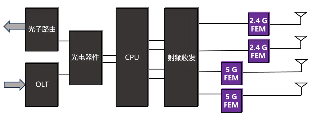 在千兆入户的前提下,部署FTTR架构主要需要用到主网关、从网关和分光器。其中主网关兼具光电信号转换、信号放大增强和光信号传输等功能,在主网关中,需要用到Wi-Fi FEM来进行信号放大增强,保证每室每厅均有高质量无线网络覆盖。