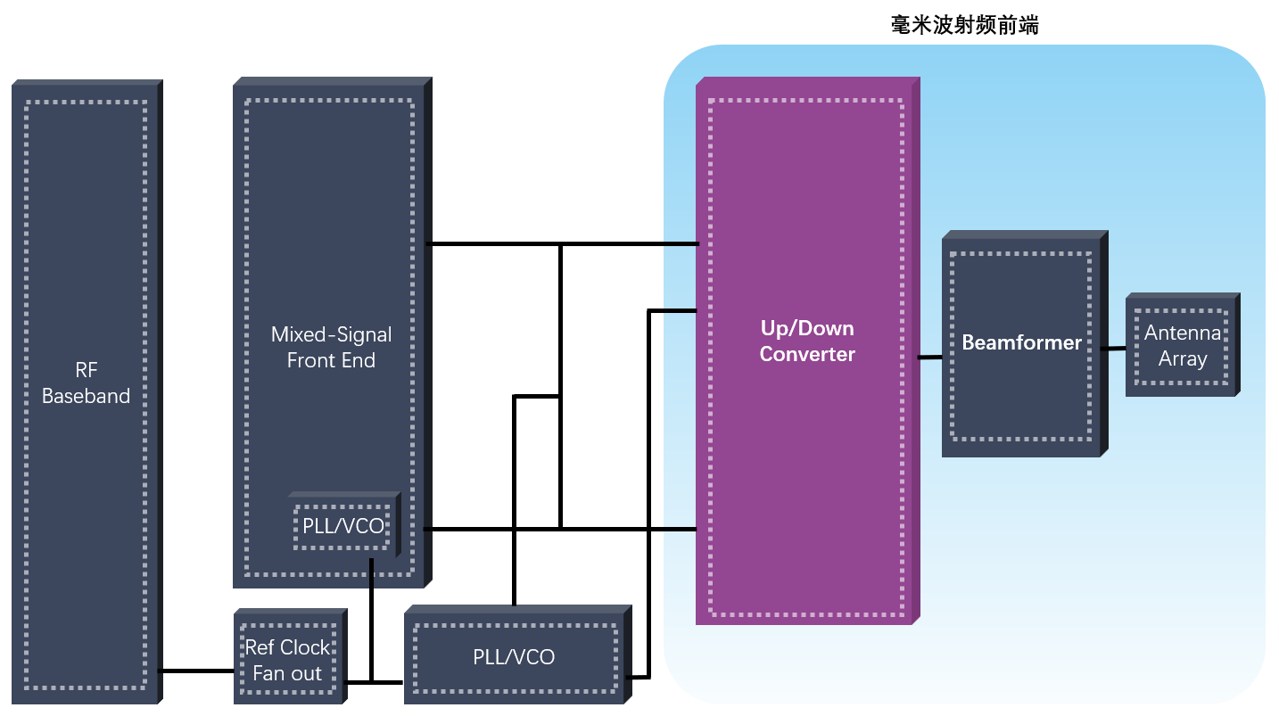 应用于通信的毫米波系统通常指的是30-300 GHz,如此高频的信号在传输过程中会造成较大的信号衰减,难以直接进行生成和处理。因此,为了顺畅的信号传输和更好的通信质量,会在毫米波通信系统中使用中频进行信号处理。而上下变频器的主要功能便是将毫米波信号在发送和接受之间的射频信号转换为中频信号,再通过解调器进行信号处理,对毫米波通信链路而言是不可或缺的核心器件。