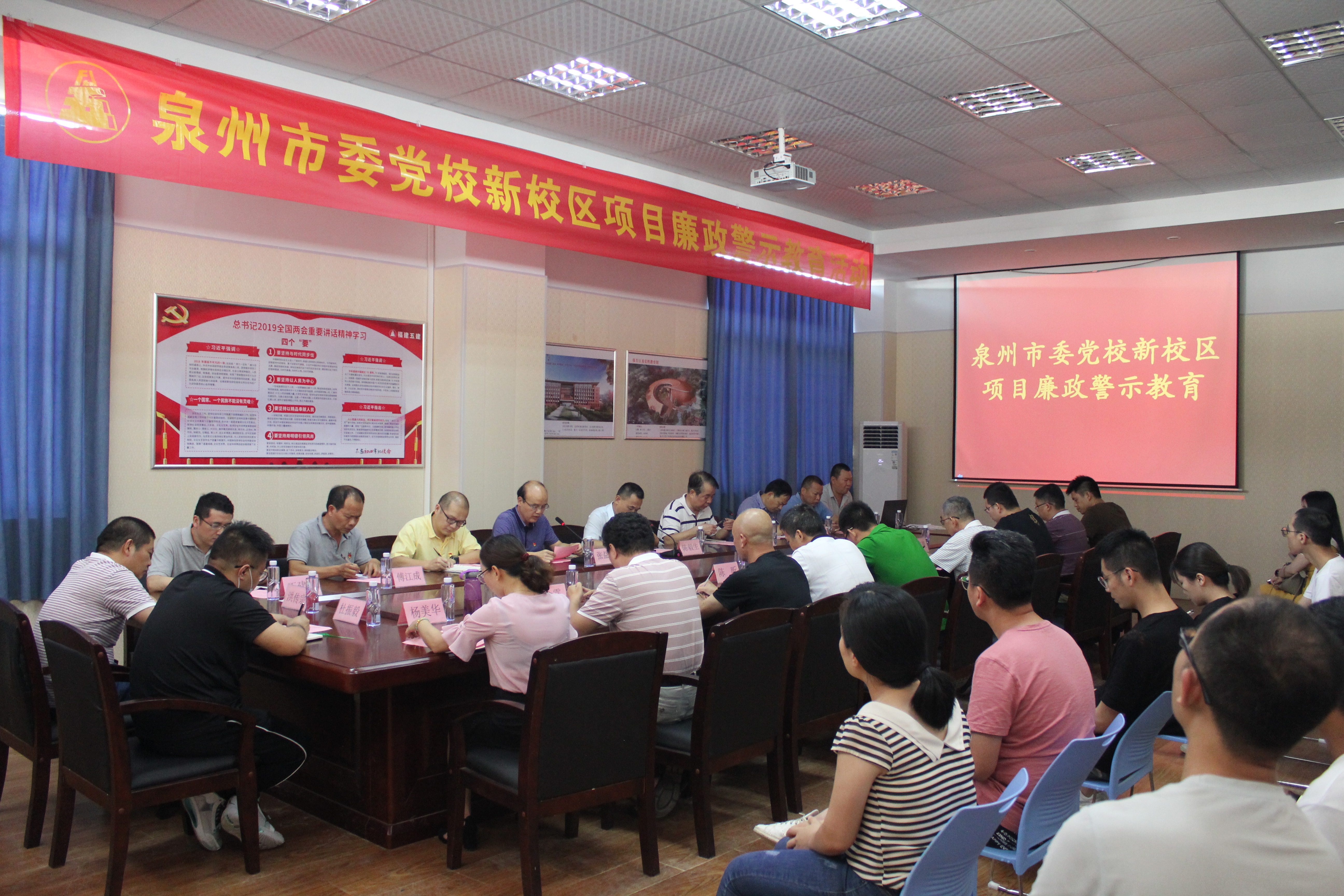 6月11日下午,泉州市委党校新校区项目建设指挥部在党校新校区项目部会议室举办廉政警示教育活动。市委党校副校长、机关党委书记陈毅生,机关党委专职副书记、纪委书记张诺维,公司党委副书记、纪委书记傅锦水,第三分公司及水电公司领导班子、纪检委员、项目部人员及项目相关单位40多人参加活动,活动由市委党校校委张益和主持。