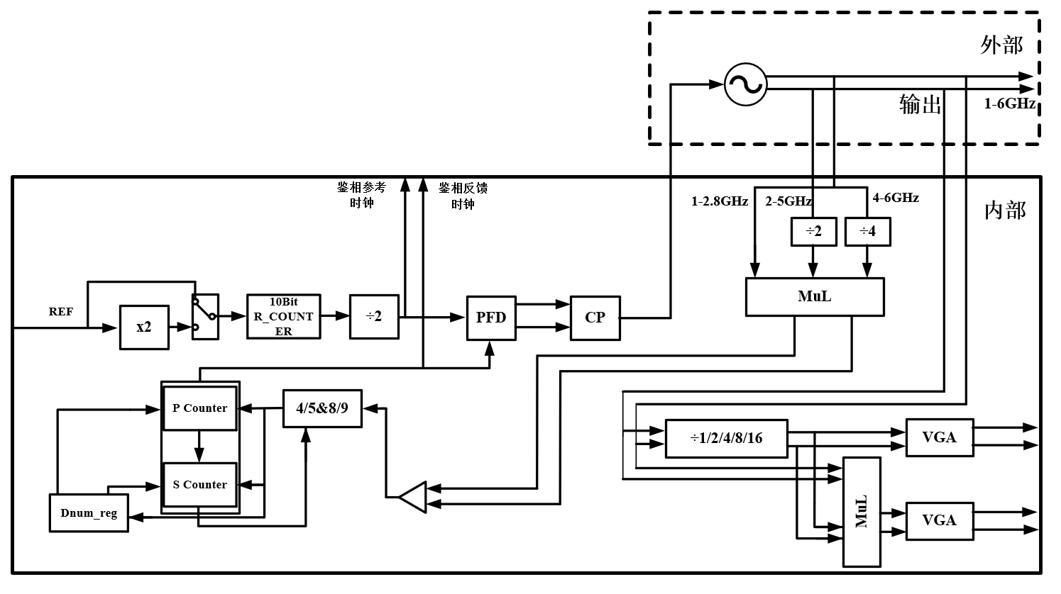 ATC78701 允许实现整数锁相环(PLL)频率合成器与外部环路滤波器、外部VCO和外部参考频率一起使用。可实现 62.5 MHz 至 5500 MHz的频率锁定。