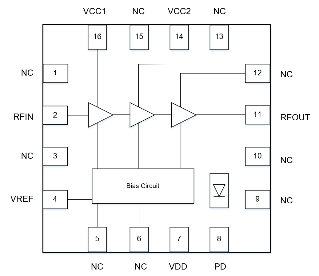 (Hetero-junction Bipolar Transistor) process. The amplifier consists of 3 gain stages with inter-stage matching, build-in input matching network, and a power detector for close loop power control operation.