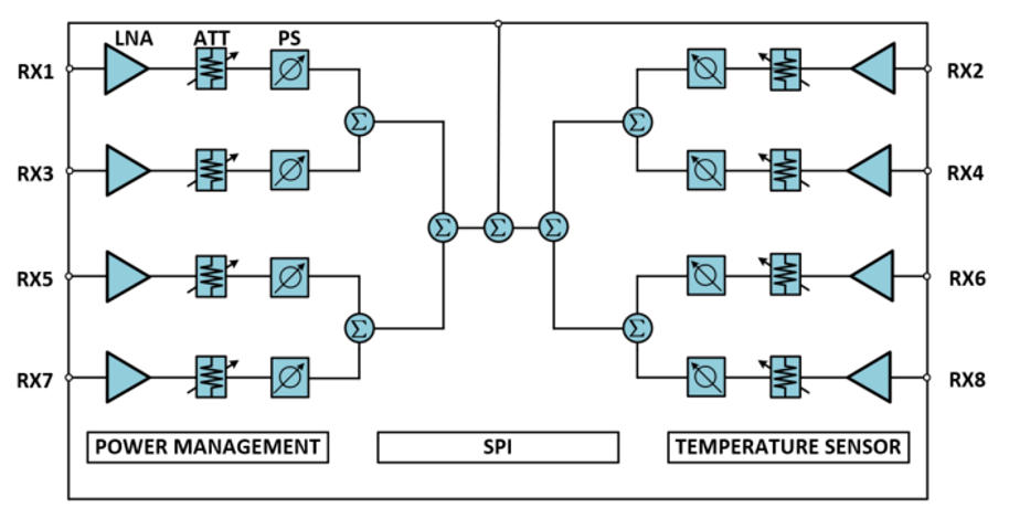 ATS2680是一款工作频率范围在10.7 GHz – 12.75 GHz 的8通道波束赋形Ku波段相控阵接收芯片,产品基于CMOS硅基工艺制成。输入信号通过八个接收通道,并在公共端口的RFIO输出。ATS2680提供6位相位(调节范围:360°,步进:5.625°)及6位幅度调节(调节范围:31.5dB,步进:0.5dB)。