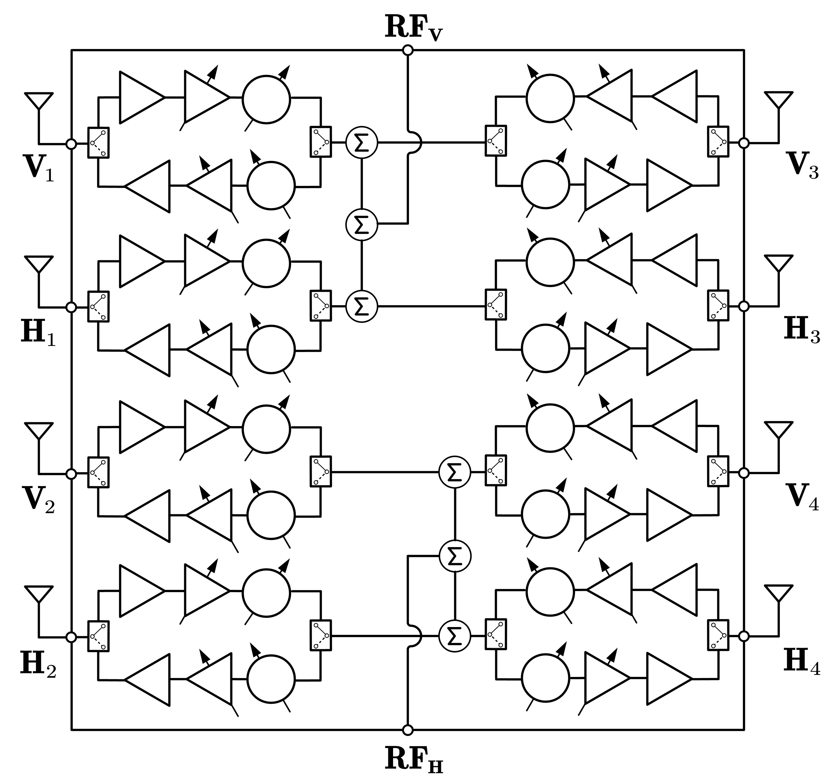 ATS7928是一款支持双频的8通道双极化相控阵收发器芯片(TRX),其频率范围在24.0至31.0 GHz和37.0至43.5 GHz,并支持两种工作模式。该核心芯片采用双极化设计,可实现4个水平通道和4个垂直通道,每个通道具有高度灵活的增益和相位控制能力,以实现辐射通道间的精确波束导向与增益补偿。芯片提供水平和垂直极化发射模式及接收模式控制引脚,支持发射模式与接收模式的快速切换。
